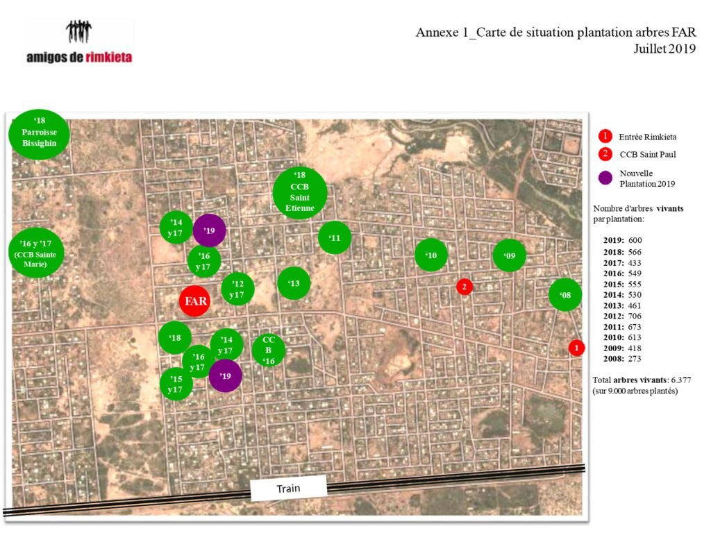 As agreed, the new plantation zones were placed to the north of the Maternelle and FAR offices, where we planted 200 trees, and to the south, where we planted 400 more. The two areas selected are continuations of the 2014, 2016 and 2017 plantations. Remember that when we choose the areas, we take into account the degree to which the neighbors will participate, after we’ve made them aware of the issues. The ease of managing watering logistics is also a factor. This year’s new zones are marked on the FAR plantation diagram.