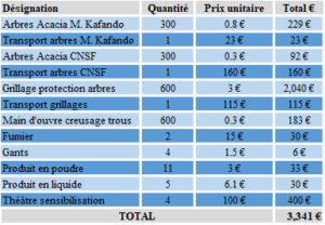 The plantation costs were 3.340 euros, as estimated. Note that, s agreed, this year we purchased half the trees from Mr. Kafando – our usual supplier – and the other half from the CNSF (National Forest Seed Center). As you’ll remember, despite last year’s bad experience with the CNSF because of a miscommunication between their offices and their nursery, the trees didn’t meet our minimum height requirement, we decided to give them another chance this year to test the quality of the trees and to have a second supplier. There was no problem this year. They met the minimum height requirement and they’ve been planted.
