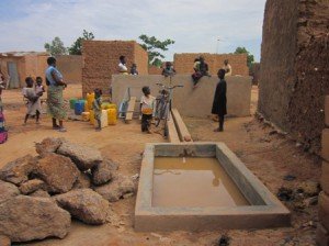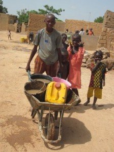 Esto es posible porque de la plataforma donde está el pozo sale una canalización a un embalse donde la gente puede recoger el agua que utilizará para hacer ladrillos, regar, limpiar en casa, etc. En la foto podéis ver a un niño con una carreta con cubos de dicho agua para hacer ladrillos.