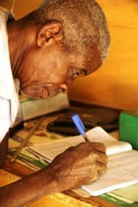 Robert, encargado del banco de cereales, anota cada venta con gran rigor y control profesional.