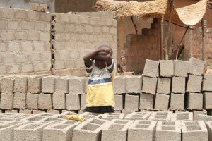 Justo al acompañar a M. Sisé a la puerta, llegaba una “niña” (tiene 19 años) con su bebé a la espalda, acompañada de una amiga. Era Mariette Souili, la madre de Sakinatou, la niñita con problemas en la columna vertebral a la que vamos a echar una mano. Sakina, efectivamente, tiene un problema serio porque tiene ya un año y un mes (ayer entendí mal al Curé) y ninguna capacidad de sujeción, la cogí y jugué un poco con ella y pude comprobar que es así. Me trajo el carnet de salud de la pequeña, que solo tiene una anotación, en fecha 31 de marzo de 2010 que dice, por lo que entiendo “Retard psyco moteur faisable. Hypotonie axiale incasable de maintenir la tête, incapable de s’assoir”. Me comentó que cuando se dio cuenta de que la niña tenía un problema, consiguió reunir el dinero para llevarla al médico y cuando por fin en marzo pudo ir, le dijo que debía llevar a la niña al pediatra cada dos meses y que en diciembre deberían operarla, pero que no tenía dinero ni nadie con quien dejar a la niña para intentar encontrar algún trabajo. La tarde anterior, hablando con Rihanata, coincidimos en que sería bueno que alguien viniera una horita por las mañanas a echarle una mano a Léonie para cortar los condimentos y preparar la comida de los niños de la calle. Así que aproveché para preguntarle que, aunque debía consultarlo con los