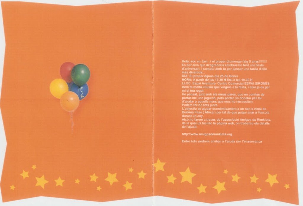 De esta conversación nació la idea de, en la fiesta del 5º cumpleaños de Javi que iban a celebrar al cabo de unas semanas, pedir a los padres de los niños invitados que no trajeran ningún regalo y que, en todo caso, para quien quisiera hacer algo, aportara dinero para ayudar a un niño de Rimkieta. Así lo explicaron en la invitación a la fiesta.