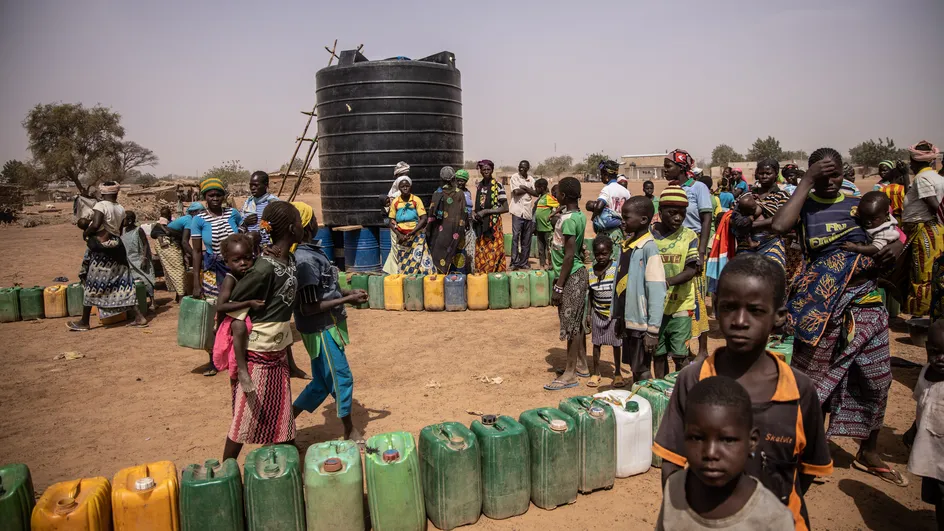 Des personnes déplacées font la queue pour obtenir de l’eau dans un camp à Barsalogho, au Burkina Faso. Photo: Olympia de Maisont/AFP