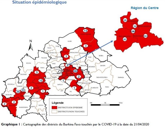 Cartographie des districts du Burkina Faso touchés par COVID-19. La superficie agrandie correspond à Ouagadogouo, la capitale.