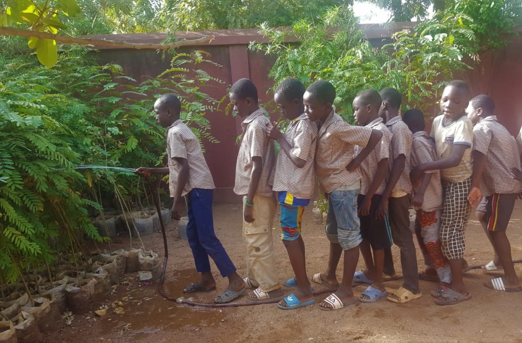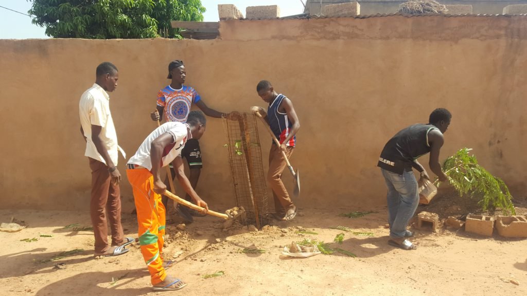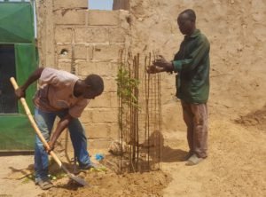 Comme chaque année, nous avons planté des « Acacia », arbre très feuillu et résistant, d’un minimum de 1,5 m, en respectant à tout moment toutes les indications reçues dans la formation que M. Kafando a faite à Lambert et Jean Marie (profondeur du trou, espace entre les arbres, engrais, irrigation, fixation des protections, etc.).