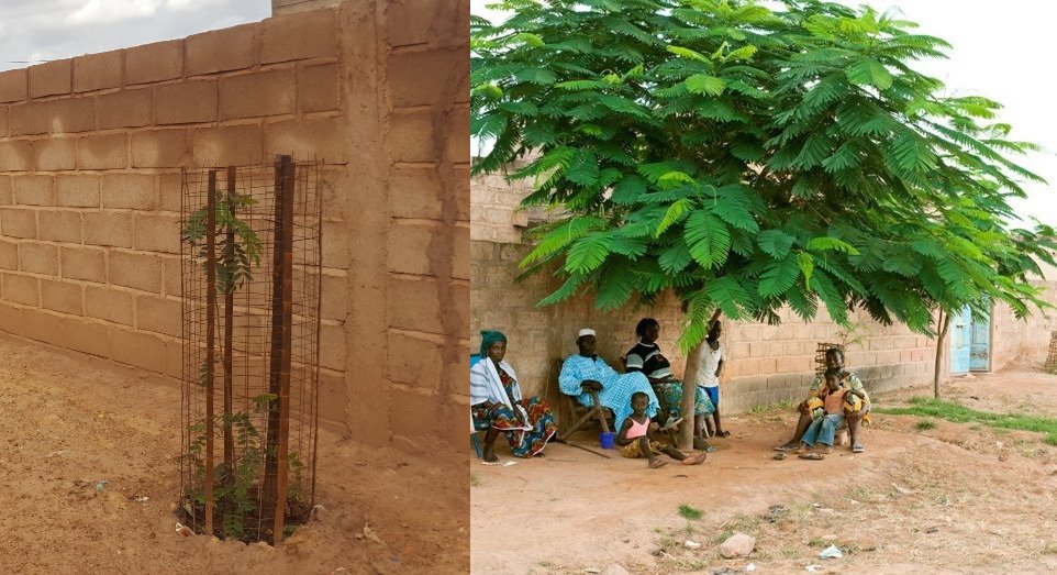 À gauche, arbre récemment planté. À droite, un des arbres de la plantation de 2015, donnant, à peine 4 ans après, une ombre feuillue à une des familles bénéficiaires.