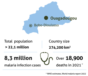 Le paludisme est endémique au Burkina et toute la population est exposée au risque d’infection : près de 50% des consultations médicales, plus de 60% des hospitalisations et 30% des décès par an sont dus au paludisme (source Ministère de la Santé). En 2021, l’OMS estimait que le pays comptait 8,3 millions de cas de paludisme et plus de 18 900 décès imputables au paludisme.