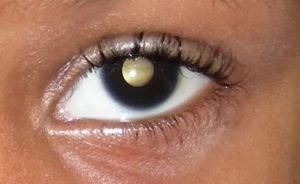 Détection d’un rétinoblastome: (i) pupille de l’œil qui semble blanc/ blanc jaune avec la lueur de la lumière, au lieu de rouge; (ii) des yeux qui semblent regarder dans des directions différentes (œil louche/strabisme); (iii) douleur ou rougeur de l’œil